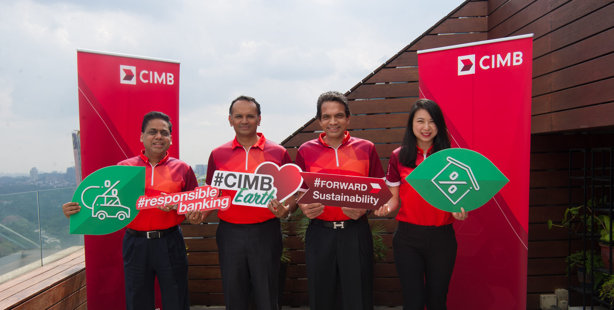 Pix: Samir Gupta, CEO, Group Consumer Banking, CIMB Group (second right); Rafe Haneef, CEO, Group Islamic Banking, CIMB Group (second left); Vipin Agrawal, Regional Head of Cards, Retail Assets and Deposits, Group Consumer Banking, CIMB Group (far left) and Yong Kwai Ling, Head of Retail Assets and Deposits, Group Consumer Banking, CIMB Group (far right) supporting CIMB’s lower financing rates for hybrid vehicles and Green Building Index-certified properties.