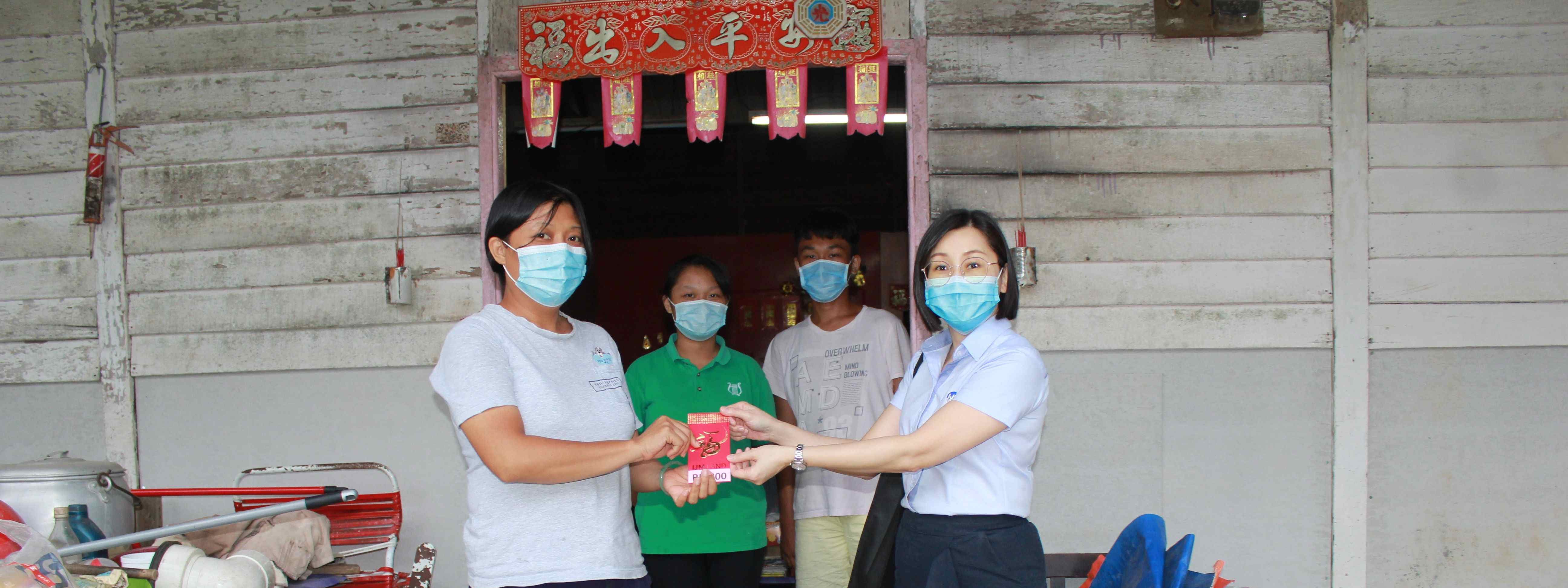 Ms Iris Yap (standing right), Assistant Manager of Brand, Communication & CSR of IJM Land Berhad handing over a red angpow to Wan Chew Liean and her family to help ease their burden during this pandemic.