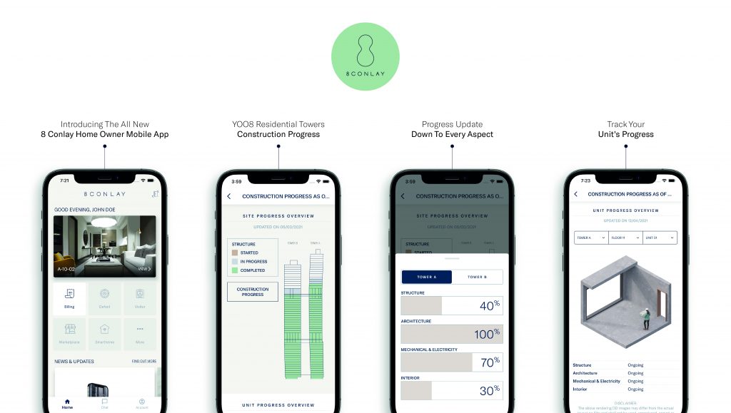 The revamped 8 Conlay mobile app offers a suite of features that will provide a seamless digital experience for home owners at 8 Conlay. For its first development phase, home owners will be able to keep tabs on the construction progress of their personal units via isometric layout drawings, while progressive billing functions enable them to easily keep track of the status of their invoices.