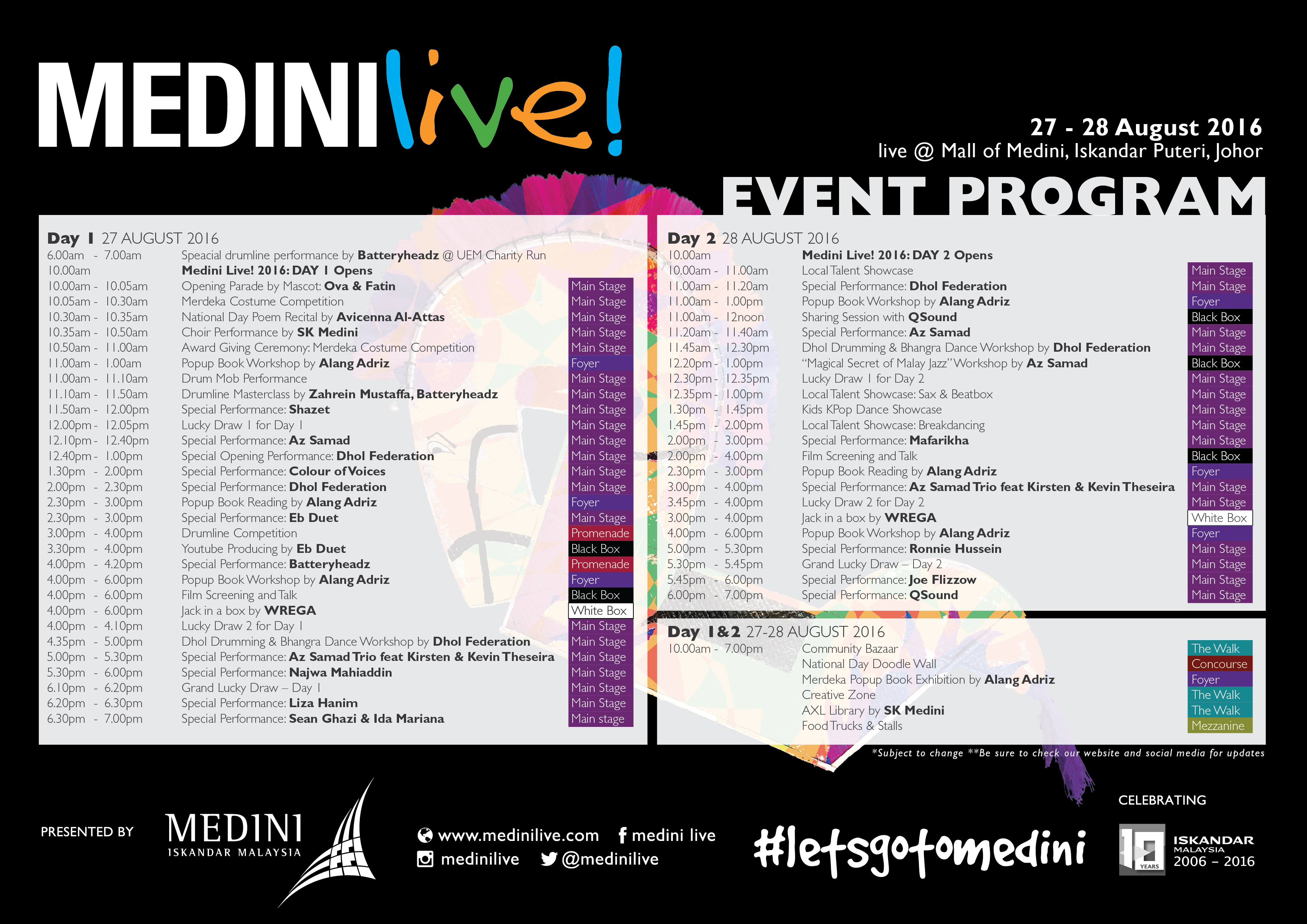 Program - Medini Live! 2016Medini Live! is a free-entry event for all. For additional information, kindly visit www.medinilive.com,  the official Medini Live! Facebook page at www.facebook.com/medinilive, or follow Medini Live! on Instagram at www.instagram.com/medinilive to learn more about this creative extravaganza!