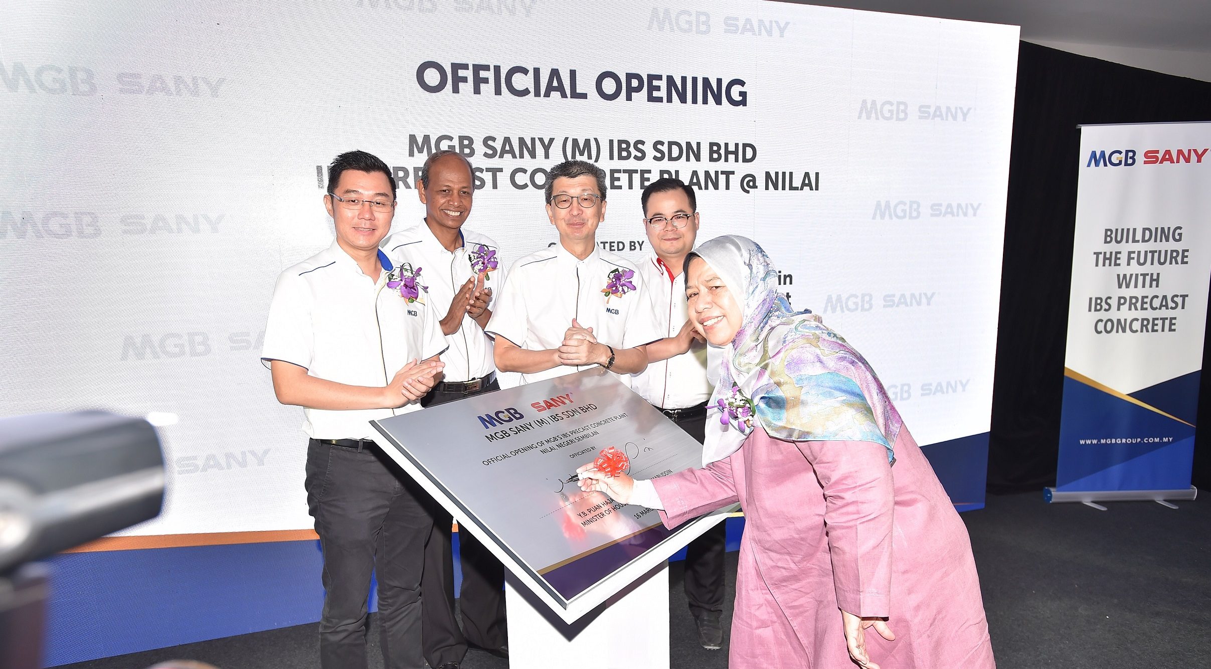 The official launch ceremony – (front row) Minister of Housing and Local Government, YB Zuraida Kamaruddin, signing the plaque to launch the new MGB IBS permanent precast concrete plant; (back row, from left) MGB Executive Director & CEO, Datuk Richard Lim; MGB Non-Executive Chairman, Dato’ Abdul Majit bin Ahmad Khan; MGB Group Managing Director, Tan Sri Lim Hock San; and Sany Malaysia Managing Director, Mr Wang ZhenYi.
