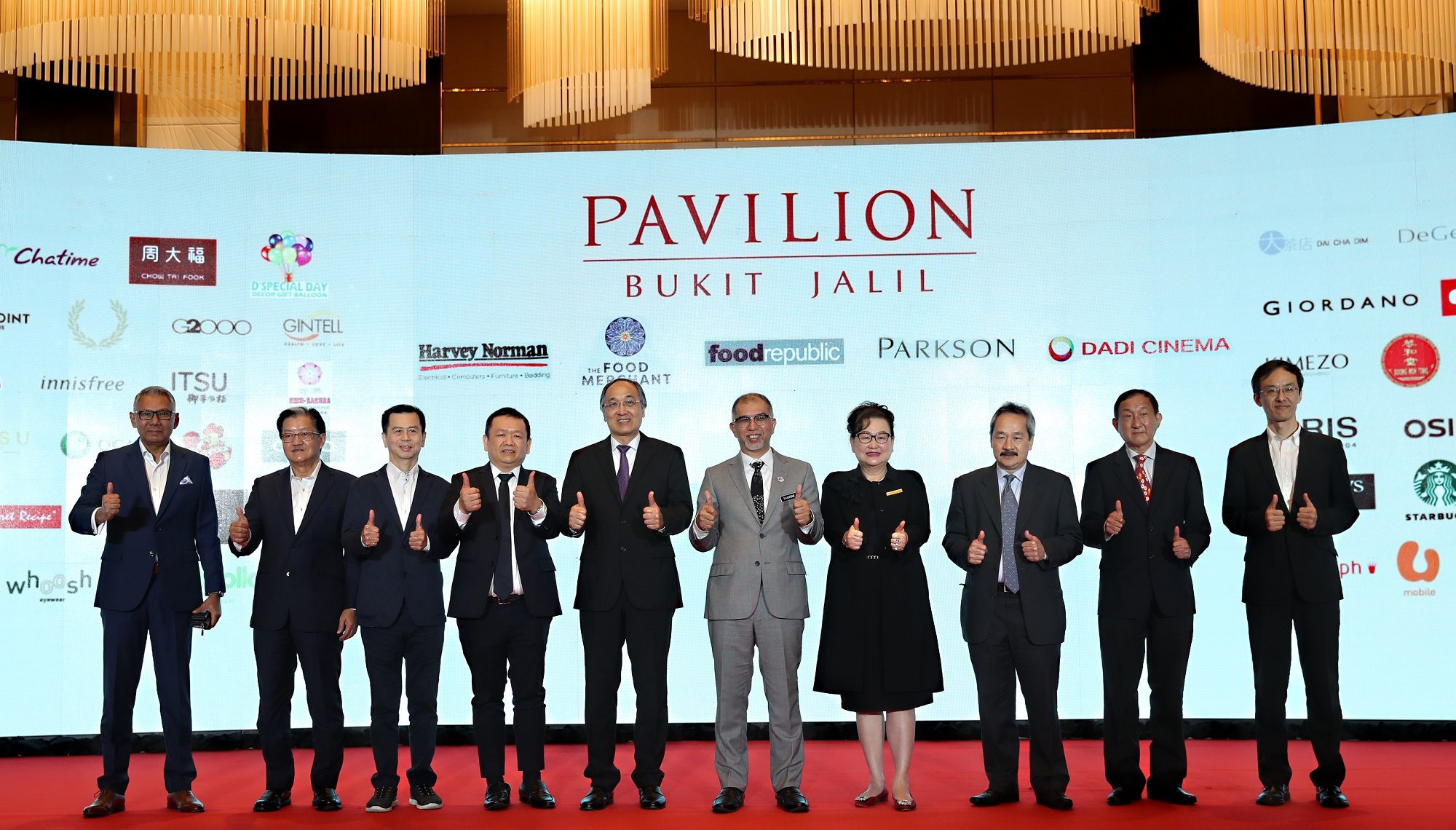 Groupshot after the unveiling of major tenants of Pavilion Bukit Jalil (from left to right): Mr. Kenneth Aruldoss, Managing Director of Harvey Norman; Mr. Ivan Tan, Group Executive Director of The Food Merchant; Mr. Jenson Ong, Managing Director of Food Republic; Mr Tan Peng Han, Design Director KL Pavilion Design Studio Sdn Bhd; Datuk Lee Whay Hoong, Director, Regal Path Sdn Bhd; YB Tuan Muhammad Bakhtiar bin Wan Chik, Deputy Minister of Tourism, Arts and Culture Malaysia; Dato’ Joyce Yap, Retail Planner, Pavilion Bukit Jalil; Mr Chua Thian Teck, Director, Regal Path Sdn Bhd; Mr. B E Law, Chief Operating Officer of Parkson and Mr. Clark Xu, Chief Executive Officer of Dadi Cinema.