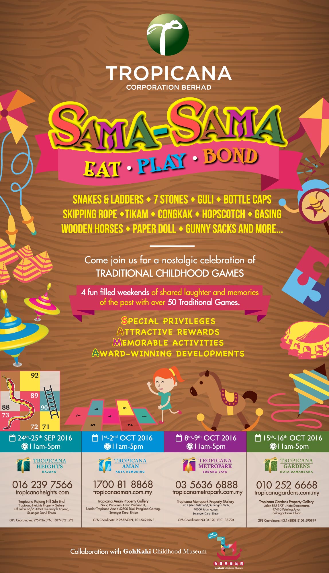 Situated at strategic locations that is equipped with great facilities, amenities, security, accessibility and connectivity, which allows for a more comprehensive and holistic lifestyle. These developments also replete with lush greenery that is much bigger than what authorities require of the developer; sustainable living and eco-friendly communities are something that they have always wanted to develop and promote. If you are looking for the opportunity to Eat, Play and Bond with your children while reminiscing your fun childhood with a wide range of fantastic traditional games, visit these galleries from 11 am to 5 pm for a fun-filled day with your children. Tropicana’s ‘Sama-Sama’ campaign will end on 16 October 2016. See you at any of the four Tropicana galleries. For more info, please visit: www.facebook.com/tropicanacorp