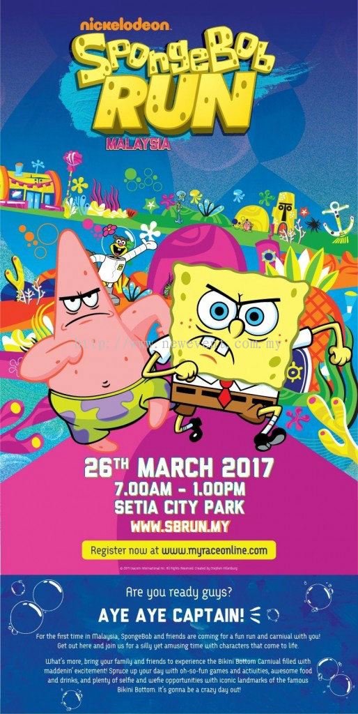 SpongeBob Run Malaysia 2017 is now open for registration till 5th March 2017 at www.sbrun.my or www.myraceonline.com