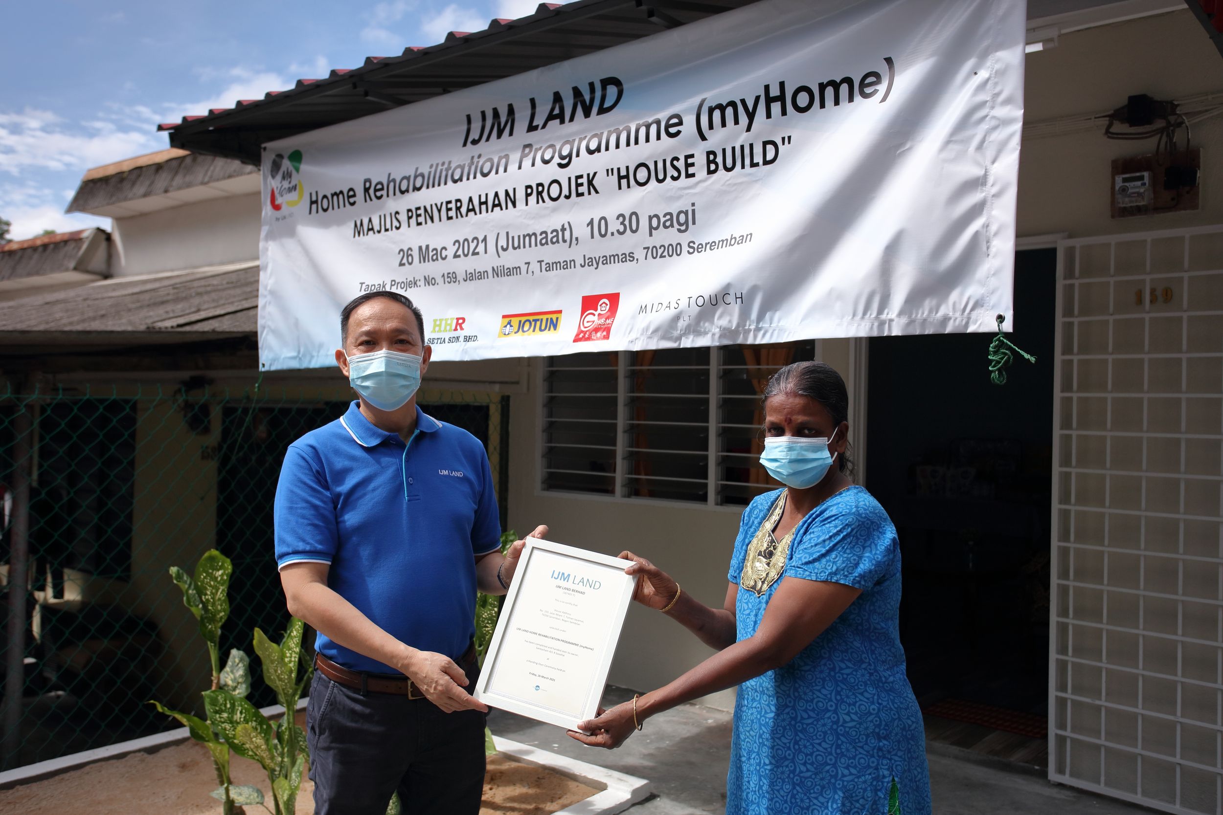 Cover Pix: Ms Sandrakhanda D/O Perumal (house owner) receiving the certificate of completion to their newly renovated and restored home from Dato’ Hoo Kim See, Senior General Manager of IJM Land Berhad.